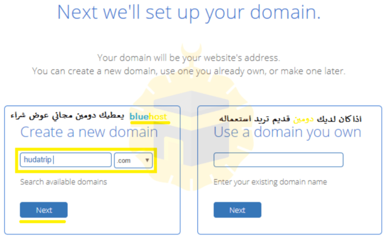 – هنا يمكنك اختيار الدومين (اسم النطاق ) الخاص بك اما بشراء او باستعمال دومين مجاني من الذي تقدمه لك بلوهوست